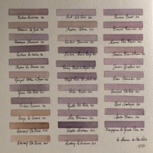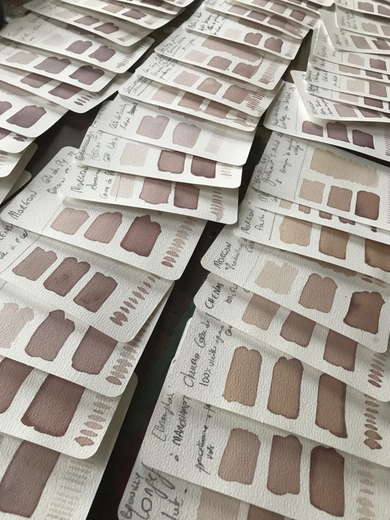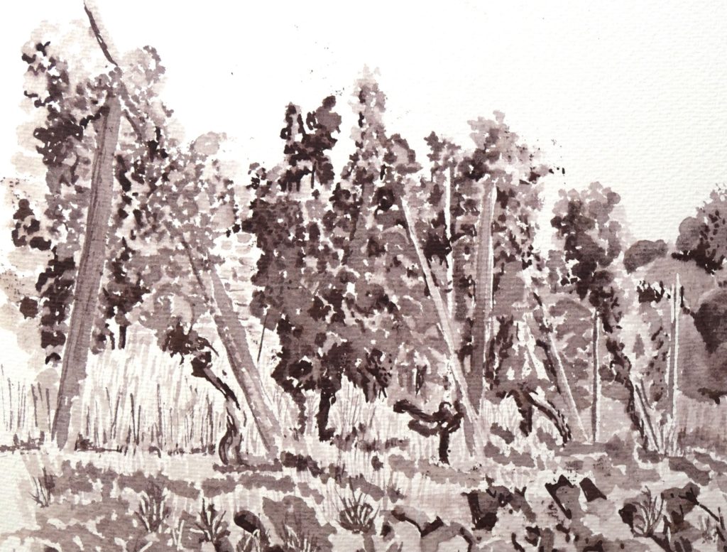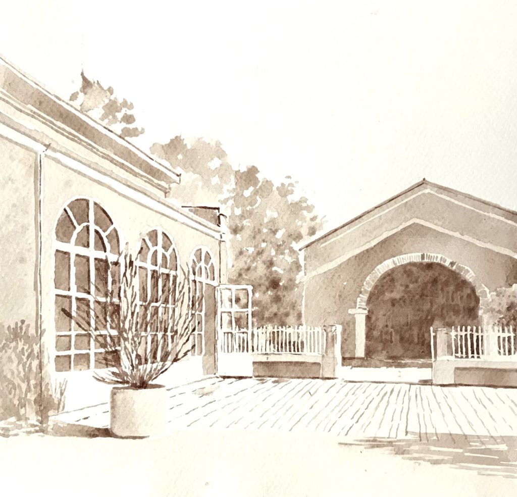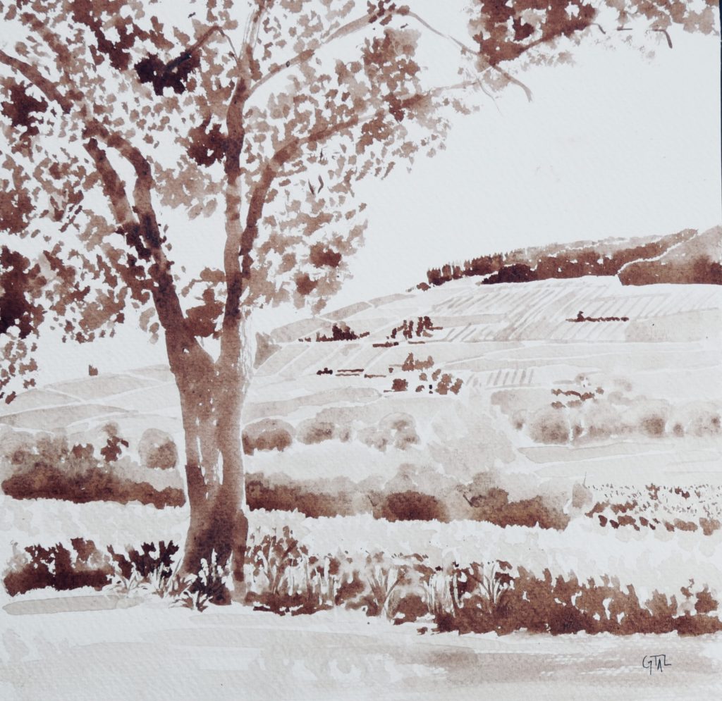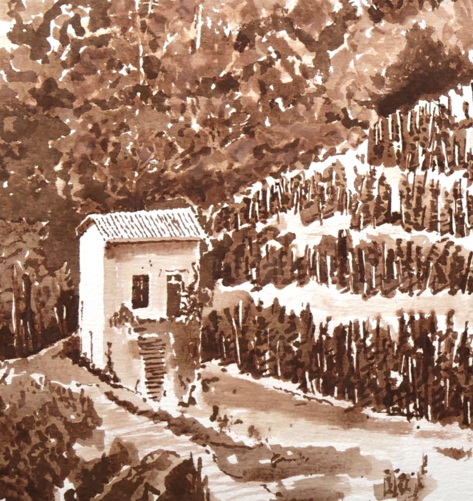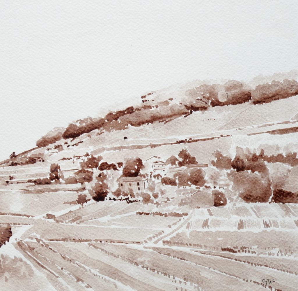 Les premières aquarelles réalisées avec du vin ouvraient des perspectives, d’abord car les nuances me rappelaient ces vieilles photos que l’on garde précieusement, et qui nous embarquent dans une nostalgie rêveuse. Et ensuite parce que le paysage d’un terroir, représenté avec le vin dont il est issu, propose une signification symbolique que je souhaitais exploiter.