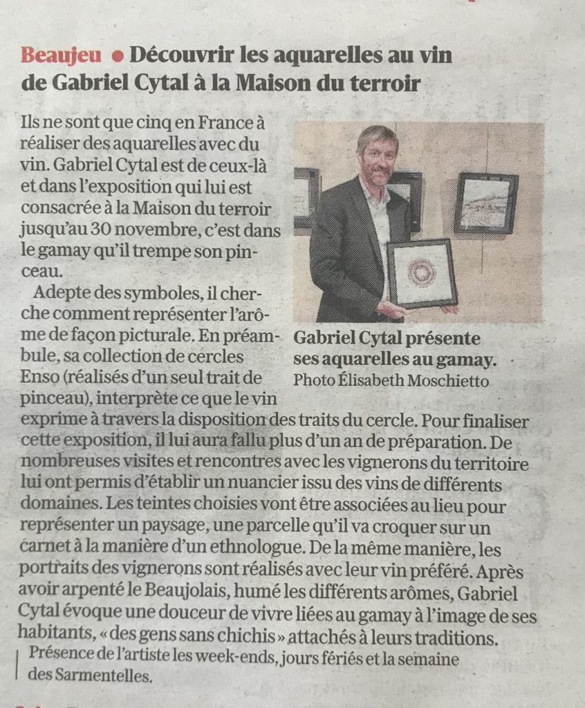 Une exposition rétrospective à Beaujeu, en novembre 2025, a présenté des aquarelles de petit format, souvent réalisées en extérieur, sur la période de mai à septembre 2025, toujours avec du vin de Beaujolais.
